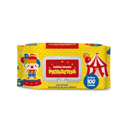 TOALLITAS HÚMEDAS CON EXTRACTO DE ALOE Y VITAMINA E PAYASITOS 100UND